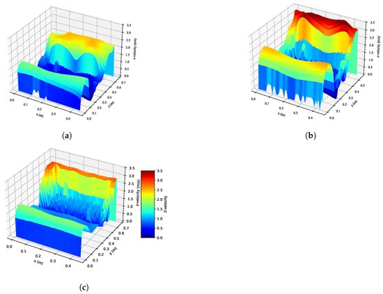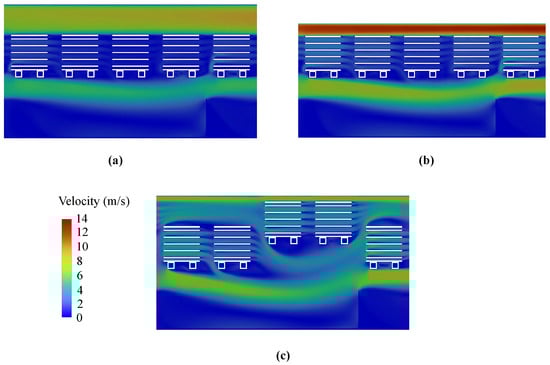 Velocity plot at 5000 s for the (a) big, (b) small, and (c) offset setups.