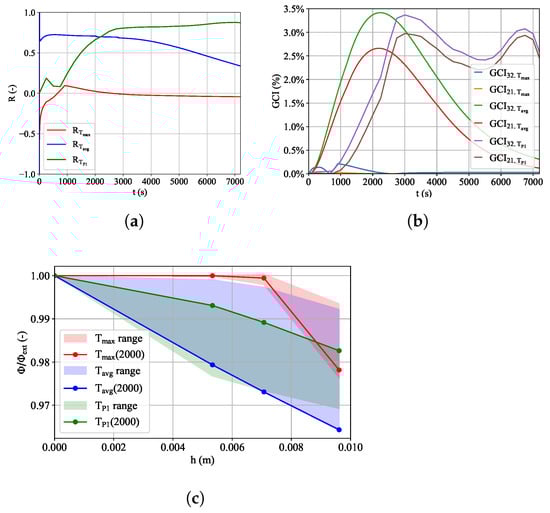 In Figure 5, the transient results of the grid convergence study are shown. The convergence or discriminating ratio R for the average brick temperature and the temperature at P1 always remains between , suggesting monotonic convergence according to Ali et al. [30]. In the case of the maximum temperature, R lies between and from 1000 s until the end. This indicates oscillatory convergence in this section. This numerical oscillatory behavior occurs because the differences between the solutions of the fine and medium mesh are very small. Upon accessing , it can be seen that in most cases, its value stays well below , ensuring sufficient precision. Figure 5c shows the relative value of the simulated temperatures to the values of the Richardson extrapolation for all three meshes. The light red, light blue, and light green areas show the envelope of all time steps, while the three lines display examples at 2000 s. It can be seen that for the maximum temperature, the difference between the medium and fine mesh in all cases is around , supporting the chosen mesh size.