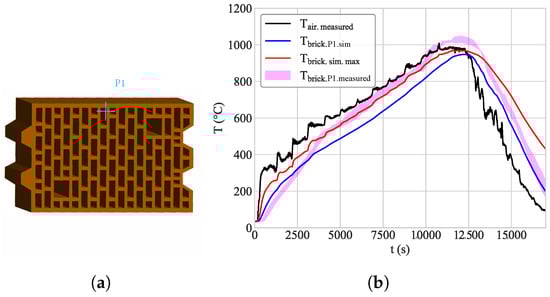 In order to evaluate the results, previously measured data were used and compared with the simulation results. A thermocouple placed in a 3 cm-deep hole on the front surface of the brick was used to measure its temperature during the heating and cooling process. Its position is shown in Figure 6a. In addition, the air temperature above the brick was measured. For validation, the measured air temperature, instead of the linear temperature ramp given in Equation (2), was used as a boundary condition in ANSYS Fluent. A comparison between the measured and simulated data is shown in Figure 6. The measured data depicted in magenta correspond to six sensors mounted at position P1 but on six different bricks. Although the measurements were taken at the same position on the brick, a difference in the temperature can be noticed. The reason for this is most likely a different heating profile across the whole oven width based on local flow and burner operation. While the brick heats up right at the beginning in the simulation, in the actual measurements, this process was delayed by around 300 s. One reason for this could be the mitigation of the remaining water from internal pores to the surface; the numerical model does not take into account these phenomena related to mass and heat transfer inside the porous medium, leading to a faster temperature increase in the beginning.