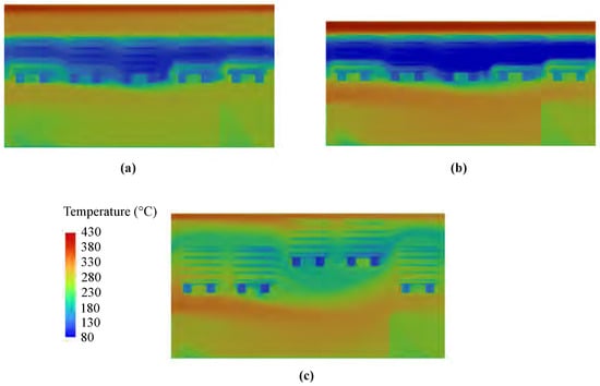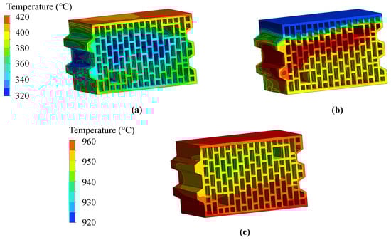 Comparison of the brick temperatures after (a) 3000 s; (b) 16,200 s; (c) 12,000 s.