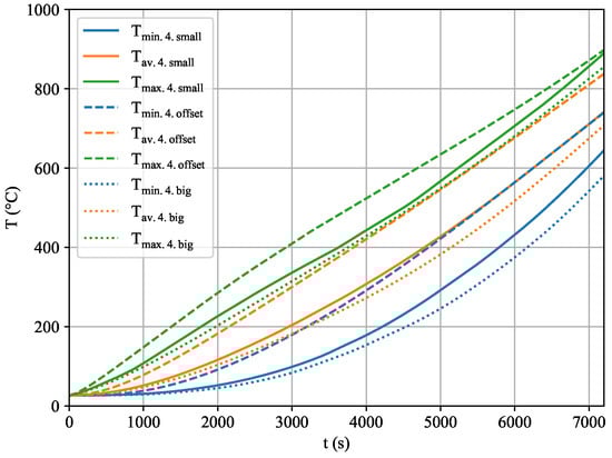 Figure 8 shows a comparison of the brick temperatures of the significant fourth brick between all three setups. The minimum temperature , the maximum temperature , and the average temperature are distinguished by color, while the individual setups are differentiated by the line style. The difference between the initial big setup and the small setup with the lower ceiling was just around 30 °C for and 65 °C for at the end of the simulated time. However, the offset setup greatly outperformed both of the others, reaching a higher by 120 °C and a higher by 160 °C compared to the big setup. Furthermore, the temperature spread within the brick, which is a measure of product quality, was improved by 100 °C.