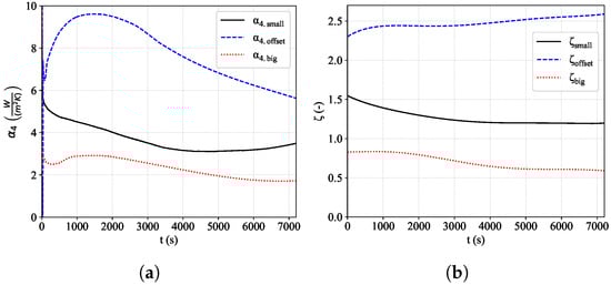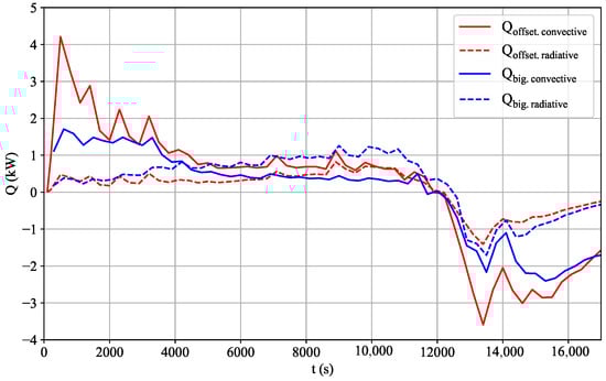 Figure 13 shows the difference between convective and radiative heat transfer. Similarly to Figure 14, it can be seen that the convective heat transfer had a stronger impact on the offset setup. The dominance of convection over radiation can be seen throughout the whole duration in the offset setup, whereas this behavior is not observed in the big setup. The sudden increase in air temperature at the beginning, however, also strongly affected the big setup. At first, convective heat transfer dominates over radiative heat transfer; over time, the radiative heat transfer’s impact exceeds that of convection. A convection-dominant process is generally advantageous when there is a high degree of mixing within the kiln, ensuring that not only the outer surfaces of the bricks but also the internal surfaces within the brick holes experience elevated air velocities. Radiation-dominant processes are limited by the fact that only surfaces directly exposed to the radiation source are effectively heated. Consequently, convection-dominant processes generally promote more uniform heating, resulting in a smaller temperature gradient within the brick, enhancing overall product quality. Therefore, even in brick kilns where heat is supplied solely through electrical heating elements, as in [7], it is essential to enhance convection for optimal heat distribution.