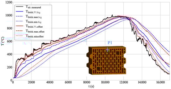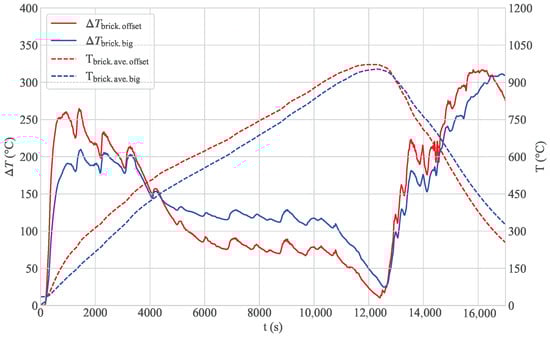 To investigate whether the benefits would be as significant using the measured temperature, further simulations using the measured air temperature as the inlet condition were performed. Figure 12 shows the comparison between the big setup in blue and the offset setup in red. It can be seen that the average brick temperature in the offset setup followed the air temperature much more closely than in the big setup. This also supports the results from Figure 11 in which it can be seen that the staggered brick setting led to a highly increased heat transfer. Fully heated, the temperature spread decreased from around 35 K to 15 K, while during the heating process, the offset setup led to higher spreads. However, it has to be mentioned that the discontinuity of the air temperature curve is related to reactions within the brick during burning. Therefore, in reality, some of the highest temperature differences might be slightly lower. There is also the option of optimizing the firing curve in the offset setup. For example, if a spread of 35 K is sufficient in terms of product quality, it is possible to accelerate the process by around 1000 s.