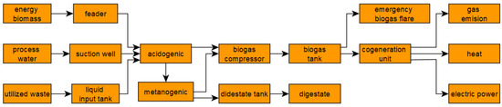 Different types of processes are used to produce biogas, which can be classified into wet and dry fermentation systems. Wet systems are the most commonly used [5]. The general scheme of biogas plant construction is shown in Figure 1, where the inputs to the system are biomass, waste, and process water, and the outputs are emitted gasses, heat, and electricity. The center of the system is the acidogenic and methanogenic processes, which can be carried out jointly (in the digester tank) [6].