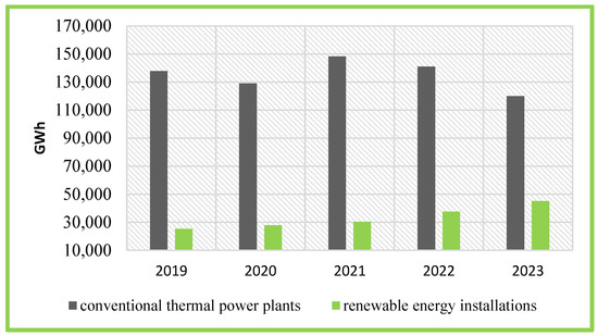 The European Green Deal is the European Union’s strategy, adopted in 2019, which aims to achieve climate neutrality in the Union by 2050. Achieving these goals obliges member states, among other things, to reduce net greenhouse gas emissions by at least 55% by 2030 compared to 1990. Meeting these requirements requires increasing the use of renewable energy sources (RESs) such as solar, wind, biomass, hydrothermal, and geothermal energy. According to data from the Energy Market Agency, energy capacity from renewable energy installations in Poland, in May 2024, increased by 20% compared to May 2023. In January–May 2024, RESs accounted for 30.35% of electricity generation, where in this period in 2023, it was 25.9% [30,31]. A summary of electric power from conventional and renewable sources in 2019–2023 is shown in Figure 2.