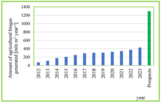 The amount of agricultural biogas produced in Poland in 2012–2023 [43] and its estimated technical potential (green bar) [44].