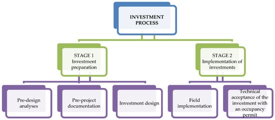 The planning, design, and construction of a planned investment project is a multi-stage and very complex process [109]. Analyzing the literature on the subject, there are many definitions of the construction process and its divisions into stages in which common features can be distinguished [110,111]. The construction process is a compilation of all the activities aimed at decision-making, the preparation of project documentation, the implementation of the project, and the commissioning of the project, which are presented in the diagram (Figure 4).