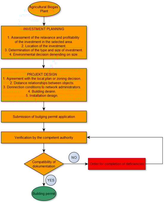 The construction of a biogas plant requires a number of decisions and permits, which vary depending on the type of activity and the location of the biogas plant. Licenses, permits, and approvals from local self-government organizations, environmental organizations, and other competent authorities are required [112]; in addition, each biogas plant must be entered in the register of agricultural biogas producers kept by the National Agricultural Support Centre.