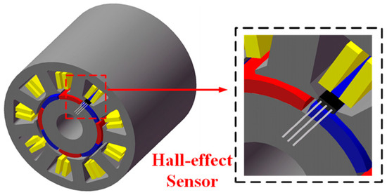 The Hall-effect sensors offer advantages such as low cost, compact size, simple installation, and strong anti-interference capabilities [7,8], enabling the acquisition of speed and position, as shown in Figure 1. The position signals provided by Hall-effect sensors can be used to achieve “three-phase six-step” control for brushless DC machines [9], though this control method suffers from significant torque ripple and severe electromagnetic noise. For PMSM, which has a back EMF closer to a sinusoidal waveform under no load, sinusoidal current drive results in lower torque ripple and better dynamic speed regulation compared to square-wave current drive [10], effectively improving machine performance. Against this backdrop, high-performance control of PMSM based on Hall-effect sensors has garnered widespread attention due to its ability to balance high power density and low torque ripple while reducing the cost of the drive system [11,12,13].
