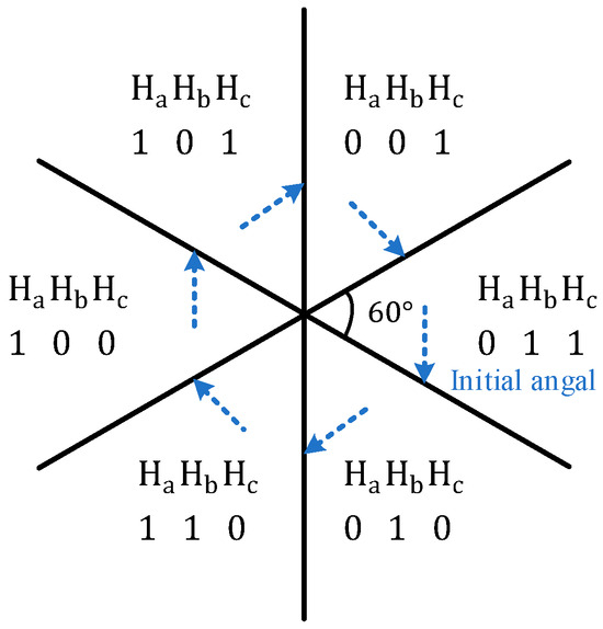 Clearly, the Hall signals divide the rotor position into six sectors on average. The starting position of each sector corresponds to the position of the Hall signal transition edge, which can be captured by detecting the edge transition. By using the starting position as the reference for each sector, the rotor position at any moment within each sector can be estimated. The correspondence between the Hall signals and the rotor position sectors is shown in Figure 3 and Table 1.