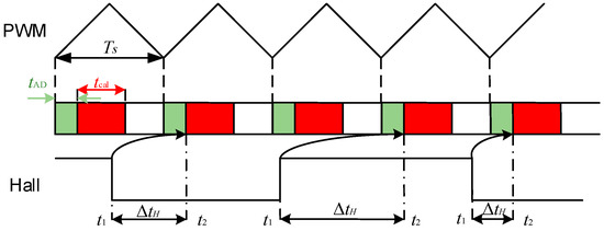 There is a delay between the capture of the Hall signal by the timer and its participation in the calculation during the PWM cycle in the digital control system. As shown in Figure 5, the delay is denoted as , where represents the AD sampling time of the digital system, and is the algorithm computation time. The delay results in an inaccurate Hall angle, which in turn reduces the accuracy of the subsequent position estimation.