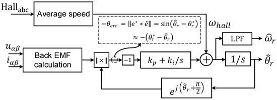 - Zhang, X.; Zhang, W. An improved rotor position estimation in PMSM with low-resolution Hall-effect sensors. In Proceedings of the 17th International Conference on Electrical Machines and Systems (ICEMS), Hangzhou, China, 22–25 October 2014; pp. 2722–2727. [Google Scholar]