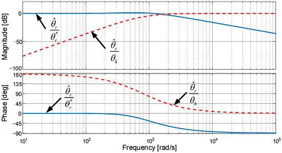 As shown in Figure 7, the estimated position of the position vector tracking observer exhibits high-pass filtering characteristics due to the combination of typical vector tracking observation of the reference position and position feedforward input. On the one hand, due to the inherent flaws of the average speed method, the intrinsic error of the position feedforward is large at low speed, especially during startup, where the maximum electrical angle error can reach ±30°. Therefore, at low speeds, the observer plays a crucial role in determining the overall loop characteristics, namely, the observer effectively compensates for the inherent error and estimates the actual position with zero-lag capability. On the other hand, at higher speeds, where the frequency exceeds the bandwidth of the observer, the performance degrades, while the position feedforward input helps maintain zero-lag capability in the entire loop. Overall, in the low-speed range, the observer compensation dominates, and as the speed increases, the compensatory system performance gradually weakens, with the Hall sensor signal taking the lead.