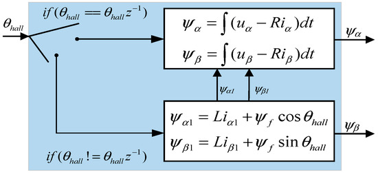 At each Hall transition, the current and Hall signals are captured. Using the accurate discrete angles provided by the Hall signals, the precise flux linkage of the machine at that moment is calculated, as shown in (11). The stator flux linkage obtained by the pure integration method is updated to correct the flux linkage and eliminate the cumulative error caused by pure integration. The control block diagram is shown in Figure 8.