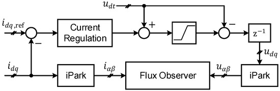 It is important to note that due to the presence of delays and inverter nonlinearities, the voltage reference output from the current regulation is not the actual output voltage. Therefore, in order to accurately observe the flux linkage, it is necessary to first calculate the accurate -frame voltage at the current time, as shown in Figure 9. After adding the dead-time compensation voltage to the reference voltage output from the current regulation, and applying modulation with necessary clamping, the dead-time compensation voltage is subtracted, and the actual output voltage for the current PWM cycle is obtained after a one-sample clamping.