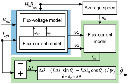 After obtaining relatively accurate stator flux linkage, the rotor angle can typically be solved directly using the arctangent method. However, the arctangent method is computationally expensive, with slow hardware processing speeds, making it unsuitable for real-time estimation. Therefore, this paper proposes combining the flux linkage with Hall signals again to construct a rotor position observer that provides high-precision rotor positions. The system diagram is shown in Figure 10. The blue section represents the stator flux linkage observer that combines flux linkage information with Hall signals, while the green section represents the subsequent rotor position observer.