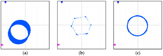 First, the effectiveness of the proposed method on the waveform of the machine’s flux linkage is validated, specifically comparing the flux linkage waveforms before and after combining with the Hall signal. Figure 12a shows the flux linkage obtained by the traditional pure integration method, where significant integration drift due to initial value bias and DC offset can be observed, rendering angle estimation unfeasible. In contrast, Figure 12b demonstrates that by utilizing the six accurate discrete position points provided by the Hall signal and employing the flux linkage-current model, six accurate flux linkage values can be obtained. This allows for the correction and updating of the flux linkage derived from pure integration, eliminating accumulated errors. From Figure 12c, it is evident that the corrected flux linkage circle is more stable and clearer.