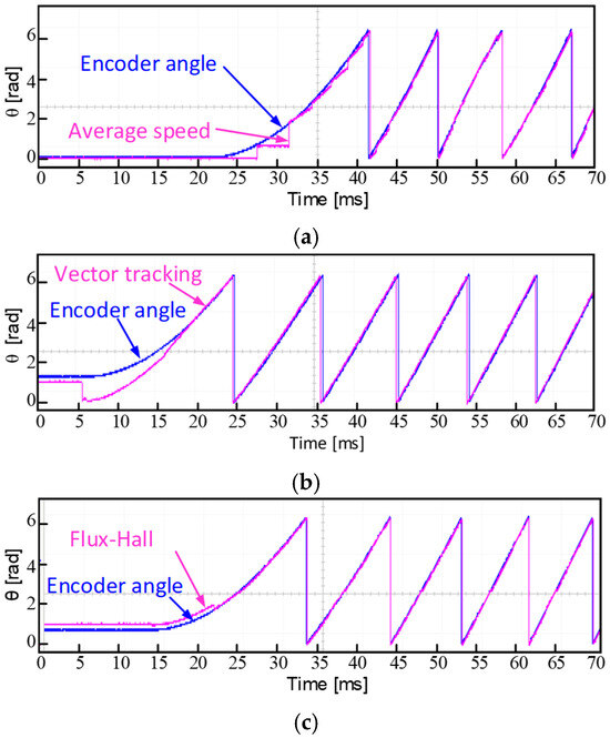 Comparison of no-load starting rotor positions (a) Average speed, (b) Vector tracking, (c) Flux-Hall.