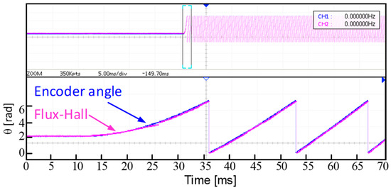 Next, the machine is started with a rated load of 0.5 Nm, accelerating from 0 to 1800/min. Figure 14 shows a comparison of the estimated rotor position during the machine’s loaded start. The experimental results confirm that the proposed method allows for rapid tracking of the actual rotor angle during startup under rated load, demonstrating good performance in loaded startup scenarios.
