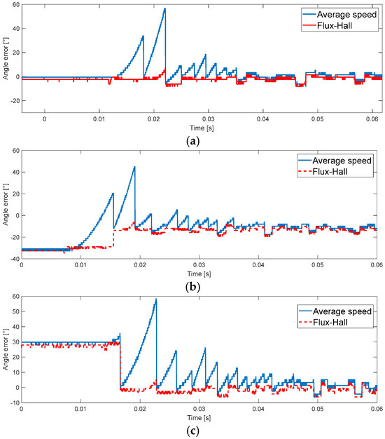 To further validate the starting performance of the proposed method, the rotor’s initial position is set to three different cases: the Hall intermediate angle, 25° advanced, and 25° delayed. Figure 15 shows the angle error during startup using the average speed method and the proposed method under different initial positions. It can be observed that regardless of the initial rotor position during startup, the proposed method results in smaller position estimation errors in the first few Hall sectors. Moreover, the method can quickly track the actual rotor position after at most two Hall transitions.