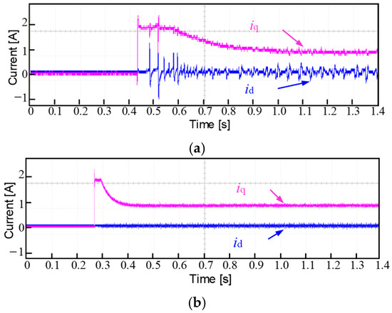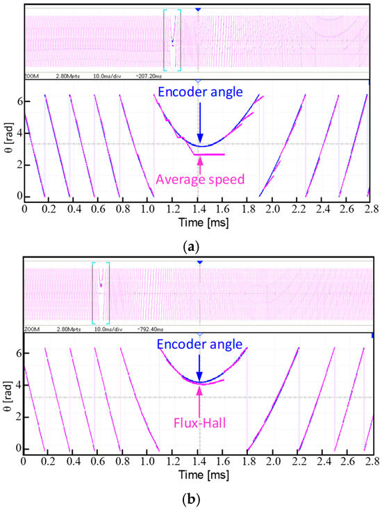 Figure 16 shows the -axis current during startup for the average speed method and the proposed method. Due to the lag and significant jumps in angle estimation with the average speed method, the -axis currents experience large fluctuations and excessive ripple. Since the rotor position does not undergo abrupt changes with the Hall boundary correction, the proposed method maintains stable current estimation, exhibiting only small pulsations.