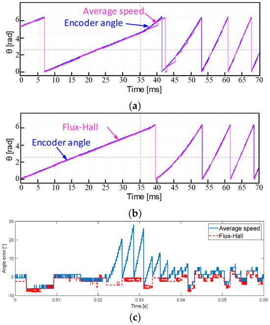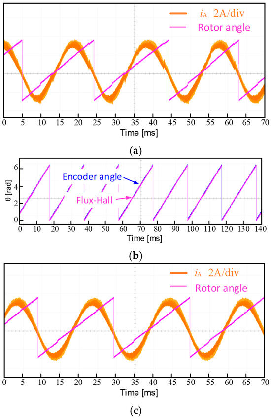 Figure 19 shows the phase current and rotor position estimation based on the average speed method and the proposed method under steady-state conditions at a speed of 750/min with a rated load. In Figure 19a, due to the cumulative angle error existing in a single sector, there is a sudden correction in position at each 60° Hall signal transition, leading to abrupt changes in current and severe waveform distortion. In Figure 19b, the proposed method allows the estimated rotor position to effectively track the actual position, with the angle being smoothly and accurately corrected within each Hall sector, resulting in no unacceptable estimation errors. Figure 19c shows that the current distortion is minimal, leading to a smoother operation of the machine.