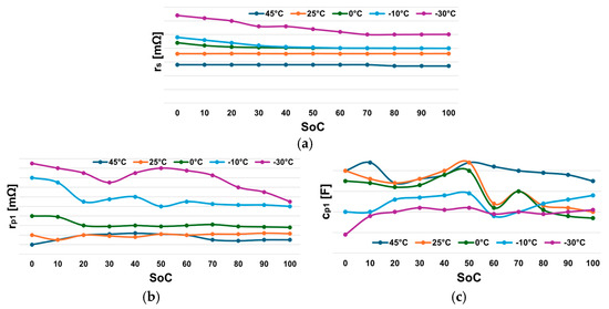 Thevenin’s model with two branches, shown in Figure 9b, also incorporates a longer time constant modeling the diffusion phenomenon in the electrolyte [64,65]. The system of equations describing, under constant current conditions, this model is as follows: