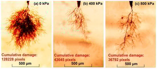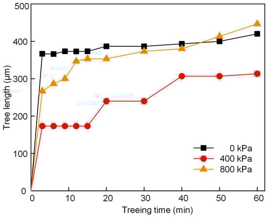 - At 60 min, the morphology of electrical trees undergoes a gradual transition from a bush-like structure to a branch-like structure as pressure increases, ultimately resulting in all trees having a branch-like structure under 800 kPa. The slowest growth rate occurs at 400 kPa.
