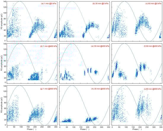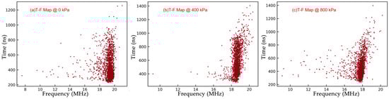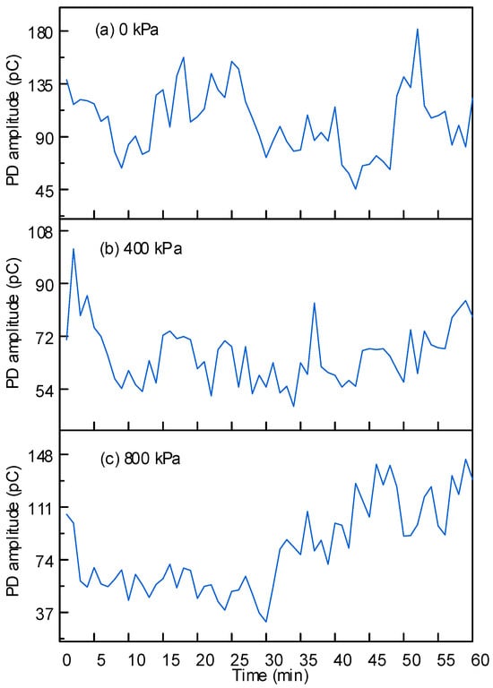 - The lowest PD amplitude appears at 400 kPa, consistent with the growth rate of electrical trees, and there is a decrease in the frequency center of PD signals with the T-F map analysis.