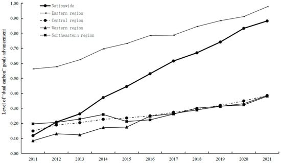 By region, progress in achieving the “dual carbon” goals has improved across all four major regions. The calculation results for the four regions are obtained based on the mean value of index data for each region and then calculated using the entropy method. The eastern region leads in advancing these goals, while the central, western, and northeastern regions lag behind the national level. In 2011, the order from highest to lowest progress was as follows: eastern region (0.562) > northeastern region (0.197) > central region (0.149) > western region (0.084). By 2021, the order was as follows: eastern region (0.976) > central region (0.385) > western region (0.384) > northeastern region (0.380). The northeastern region’s progress has been the slowest, gradually falling behind the central and western regions over time.