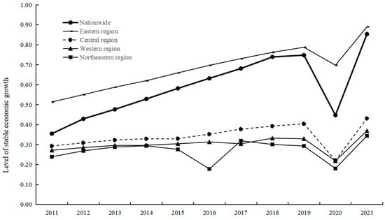 From a regional perspective, the level of stable economic growth in China is uneven among regions, with the eastern region in a leading position, while the gap between the central, western, and northeastern regions and the eastern region is gradually widening. Although the public health events in 2020 will reduce the stable economic growth level of major regions in the short term, all regions have stable growth potential, and the stable economic growth level will recover significantly in 2021. The stable economic growth level in 2011 was in the order of east (0.513) > central (0.293) > west (0.271) > northeast (0.239) from high to low. In 2021, the level of stable economic growth in the eastern region (0.889) > central region (0.431) > western region (0.369) > northeastern region (0.344) was in descending order. The rate of stable economic growth in the eastern region was significantly higher than that of the central, western, and northeast regions. This is directly related to the strong foundation of economic development, the optimization of industrial structure, and the higher degree of openness and innovation in the eastern region.