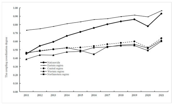 During the observation period, the coupling coordination degree between China’s advancement toward “dual carbon” goals and economic stability growth, as well as that of the four major regions, is shown in Figure 4. The coupling coordination degree at the national level displays a trend of fluctuating increase, rising from 0.452 in 2011 to 0.931 in 2021, indicating that China has maintained steady economic operation while advancing toward the “dual carbon” goals. Although there was a slight decline in 2020 due to fluctuations in economic growth stability, the overall coupling coordination degree between the “dual carbon” goals and economic stability growth increased. This demonstrates the success of the “seeking progress while maintaining stability” approach, with positive and steady advancement toward the “dual carbon” goals.