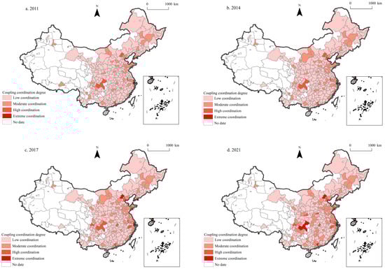 Spatial distribution pattern. Using ArcGIS 10.8, the coupling coordination degree between advancement toward the “dual carbon” goals and stable economic growth in 2011, 2014, 2017, and 2021 was classified into four levels: low coordination (0.000–0.300), moderate coordination (0.301–0.500), high coordination (0.501–0.800), and extreme coordination (0.801–1.000). The spatial visualization results are shown in Figure 5.