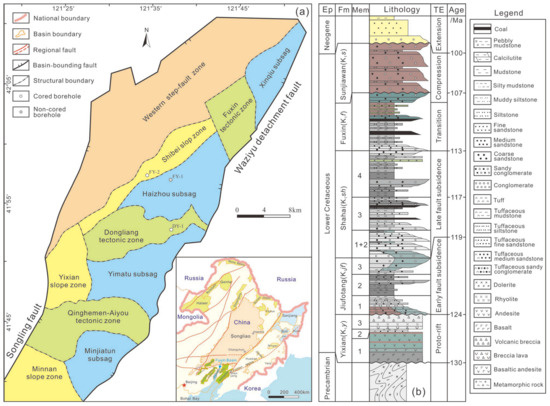 Map of the structural units in the Fuxin Basin, showing the basin distribution in Northeast China (a) (after [36]), and the generalized stratigraphic column of the Fuxin Basin (b) (after [21]). Abbreviations: Ep—epoch; St—Stage; Fm—Formation; Mem—member; TE—tectonic evolution.