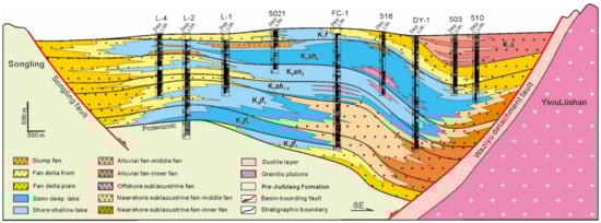 Previous studies have identified two depositional systems in the Fuxin Basin: the fan delta-slump turbidite fan–shore–shallow lake system and the subaqueous fan–semi-deep lake system [21]. In this study, we document the sedimentary filling process that occurred during the Early Cretaceous in the basin (Figure 2).