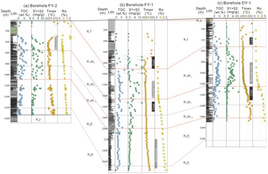 All analyzed samples were collected from three boreholes, namely, DY-1, FY-1, and FY-2, located in the eastern, central, and western parts of the Fuxin Basin (Figure 1a). Borehole DY-1 reached a total depth of 1900.51 m and intersected the late K1jf3, K1sh, K1f, and K1s strata. Borehole FY-1 reached a maximum depth of 2760.85 m and intersected the middle-late K1jf, K1sh, and K1f strata. Borehole FY-2 reached a total depth of 1862.04 m and intersected the late K1y, middle-late K1jf, and K1sh strata. A total of 287 high-resolution samples from the three boreholes were selected for LECO and Rock-Eval analyses [21]. Additionally, vitrinite reflectance (Ro) of 104 samples and maceral composition of 44 samples from three boreholes were analyzed.