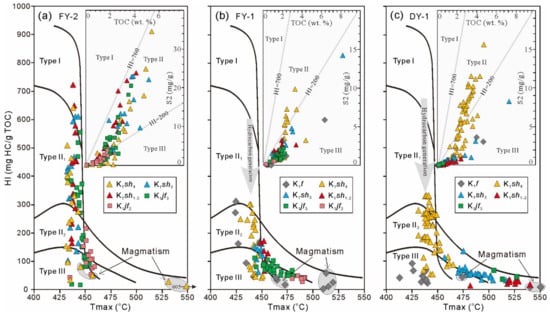 Crossplots of Tmax vs. hydrogen index (HI) (according to [39]), and S2 vs. TOC correlations (according to [40]) from mudrocks of boreholes FY-2 (a), FY-2 (b), and DY-1 (c).