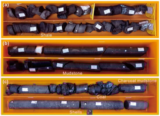 OM enrichment during sedimentation provides the essential material for the formation of source rocks [41]. Continental source rocks form in various sedimentary environments, including deep lakes, semi-deep lakes, shallow lakes, and swamps [42,43]. These environments play a crucial role in determining the combination of organic sources [2]. The semi-deep and deep lake facies are more favorable for the development of large-scale excellent source rocks [44]. Two types of oil- and coal-bearing source rocks were formed during the Early Cretaceous period in the Fuxin Basin (Figure 5). Oil-bearing source rocks consist of thick layers of dark gray and gray-black massive mudstone (Figure 5a), as well as thin layers of shale (Figure 5b), found in the semi-deep lake facies of K1jf2-3 and K1sh4 (Figure 2). In contrast, coal-bearing source rocks, characterized by black and gray-black charcoal mudstone and coal seams containing abundant shell fossils (Figure 5c), are present in the shore-shallow lake facies of K1sh3 and K1f (Figure 2). These have been partially reported by [21,29]. The thickness of source rocks from K1sh4 in the eastern basin (~500 m) is significantly greater than that in the central (~250 m) and western basins (~160 m) (Figure 3). In contrast, the thickness of source rocks from K1jf2-3 in the central basin (~700 m) exceeds that in the eastern (>200 m) and western basins (~100 m) (Figure 3). Additionally, source rocks in the eastern basin of K1sh3 (~250 m) are superior to those in the central basin (~160 m) (Figure 3). Thus, the spatiotemporal characteristics of two source rocks exhibit significant differences. This is probably related to the evolution of the Fuxin supra-detachment basin [21].