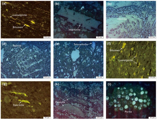 Photomicrographs of macerals from oil- (a–f) and coal-bearing source rocks (g–i) in the Fuxin Basin. (a) Lamalginite and bitumen from black-gray mudstone, FY2-60, 1288.64 m, K1jf3; (b) Inertinite from dark-gray silty mudstone, FY2-1, 1731.3 m, K1jf2; (c) Vitrinite from black coal, DY1-C5, 1250.0 m, K1sh3; (d) Telinite from gray-black carbonaceous mudstone, DY1-C4, 1266.0 m, K1sh3; (e) Telocollinite from black coal, DY1-C3, 1282.0 m, K1sh3; (f) Lamalginite and bitumen from dark-gray mudstone, DY1-22, 718.3 m, K1sh4; (g) Sporinite from black-gray mudstone, FY2-104, 435.1 m, K1sh4; (h) Fusinite from dark-gray mudstone, DY1-28, 718.3 m, K1sh4; (i) Pyrite from dark-gray mudstone, FY2-98, 530.0 m, K1sh4.