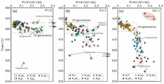 Graphs illustrating the production index and Tmax values for various mudrocks in the western (a), central (b), and eastern (c) parts of the Fuxin Basin (after [21]).