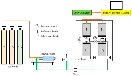 Methane and CO2 adsorption and displacement experiments were conducted on coal samples using the volumetric method [30]. Helium (He) was used to calibrate the reference cylinder, sample cylinder volume, and coal sample skeleton volume, which are denoted as VRC, VSC, and VS, respectively. A schematic illustration of the experimental set-up is provided in Figure 2. As indicated in the figure, this apparatus consists of five major components: air bottle, vacuum pump, incubator, A/D converter, and data acquisition system.