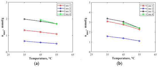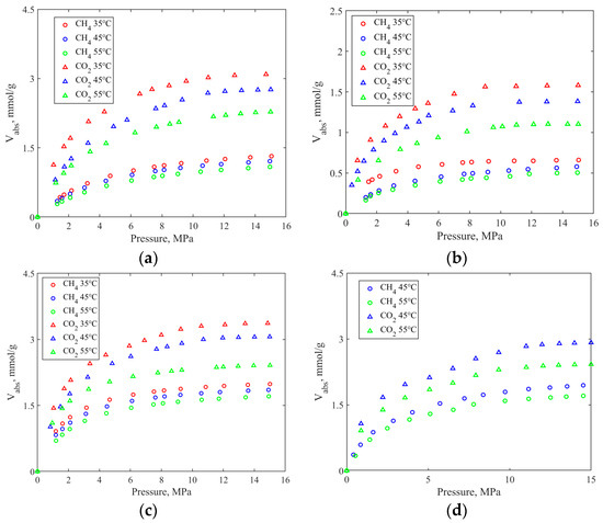 Adsorption capacity of methane and CO2 at different temperatures: (a) Core 1; (b) Core 2; (c) Core 3; and (b) Core 4.