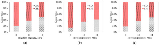 Results of methane recovery by CO2 displacement under different pressures obtained from Core 1: (a) 35 °C; (b) 45 °C; and (c) 55 °C.
