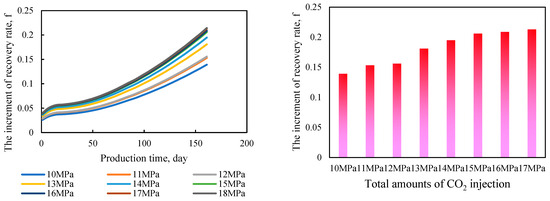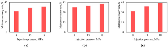 We have established different injection pressures, ranging from 10.0 to 18.0 MPa, to compare the final recovery rate of methane from the well. We ensure the total amount of injection is consistent, that is, 0.7 PV, which means the injection rates will vary. As shown in Figure 12, the simulation results suggest that for deep coal seams, the injection pressure of CO2 does not necessarily exhibit a direct positive correlation with the recovery rate of methane. In fact, when the injection pressure exceeds 15.0 MPa, the increase in recovery rate is very minimal.