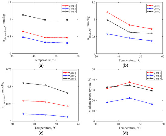 Results of methane recovery by CO2 displacement under different temperatures. (a) Methane adsorption capacity after displacement; (b) CO2 adsorption capacity after displacement; (c) methane desorption capacity after displacement; and (d) methane recovery rate.