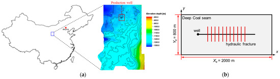 A simulation model, considering multi-component competitive adsorption, desorption, and seepage flow under high temperature and high pressure, has been used to evaluate the effectiveness of injecting CO2 into a deep coal seam. The primary objective of this study is to optimize the injection parameters for CO2 to enhance methane recovery during the later stages of deep coal bed methane production. The simulations were performed using the CBM module of Landsim (Tracy Technology Company, Beijing, China, 2023) to enhance methane recovery and CO2 sequestration in a deep CBM reservoir. In this study, the impacts of CO2 injection rate, amount, and pressure were investigated. Figure 8b presents the single horizontal well model in a deep coal seam, which includes the hydraulic fractures simulated by Petrel-Kinetix (Schlumberger, Houston, TX, USA, 2018). There are 11 fracturing sections, with an average fracture length of about 200 m. The production length of the horizontal well is approximately 1200 m. Other input parameters for the simulation model can be found in Table 2. The target field’s deep coal seam originates from Daning-Jixian in western China, with a burial depth of approximately 2000 m [32,33], as shown in Figure 8a. It contains no native movable water. However, the permeability of the coal cleavage is relatively low, requiring hydraulic fracturing to enhance the connectivity between the well and the reservoir.