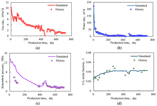 The typical well is simulated with a gas rate as shown in Figure 9a. Figure 9 displays the history matching results of gas production, water production, bottom-hole pressure, and CO2 molar fraction, with an overall matching rate of 92%. The process of history matching first fits the water production. As observed from the matching result of water production in Figure 9b, due to the initial simulated fracturing fluid volume being insufficient, the water production effect is well fitted after extending the injection time and increasing the fluid volume. This results in a matching effect greater than 90% and a backflow rate of 76%. It is noticeable that the water production decreases rapidly in the later stage of historical production. This is due to the improved seepage channel of the fracture and cleavage after the gas well produces gas. The relative permeability of the fracturing fluid decreases, so some fracturing fluid remains in the formation.