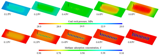 (2) Using the experimental rules as a foundation and adopting numerical simulation methods, we first studied the rule of CO2 extraction during the historical fitting stage of a typical well in deep coal rock. Then, according to the simulation results, the mine parameters for later CO2 injection were optimized. The optimal total injection volume is around 0.7 PV, and the optimal injection pressure is about 15 MPa. This is because when the total injection volume continues to increase, the excess CO2 will reduce the seepage space and channels for the desorption of methane, and too high of a pressure may damage the coal body and reduce the permeability of the coal seam cleavage, thus failing to further increase the recovery rate.