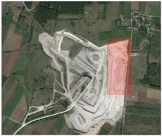 The evaluation of energy consumption was conducted for a gypsum open-pit mine located in the southern part of Poland. The proximity of the mine to residential structures imposes restrictions on the use of blasting operations. Consequently, extraction is performed using a combination of mechanical methods and blasting techniques. The area where these combined extraction methods are applied is depicted in red in Figure 1.