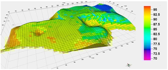 The gypsum deposit exhibits a gypsum content ranging from 75% to 99%, as illustrated in Figure 2 The uppermost layer of the deposit is primarily composed of low-calcination gypsum with a purity between 75% and 85%. Additionally, this layer is characterized by the presence of various geological features such as intrusions and sinkholes. The quality of the deposit improves progressively with depth (from the second operational level), reaching gypsum purity levels between 90% and 99%.
